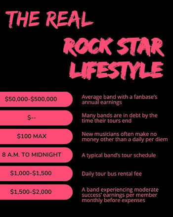 A band experiencing a moderate level of success could make $1,500 to $2,000 monthly per member before expenses. And there are many, many expenses include crew member salaries and transportation. Taking this into consideration, many bands are in debt by the time their tours end.